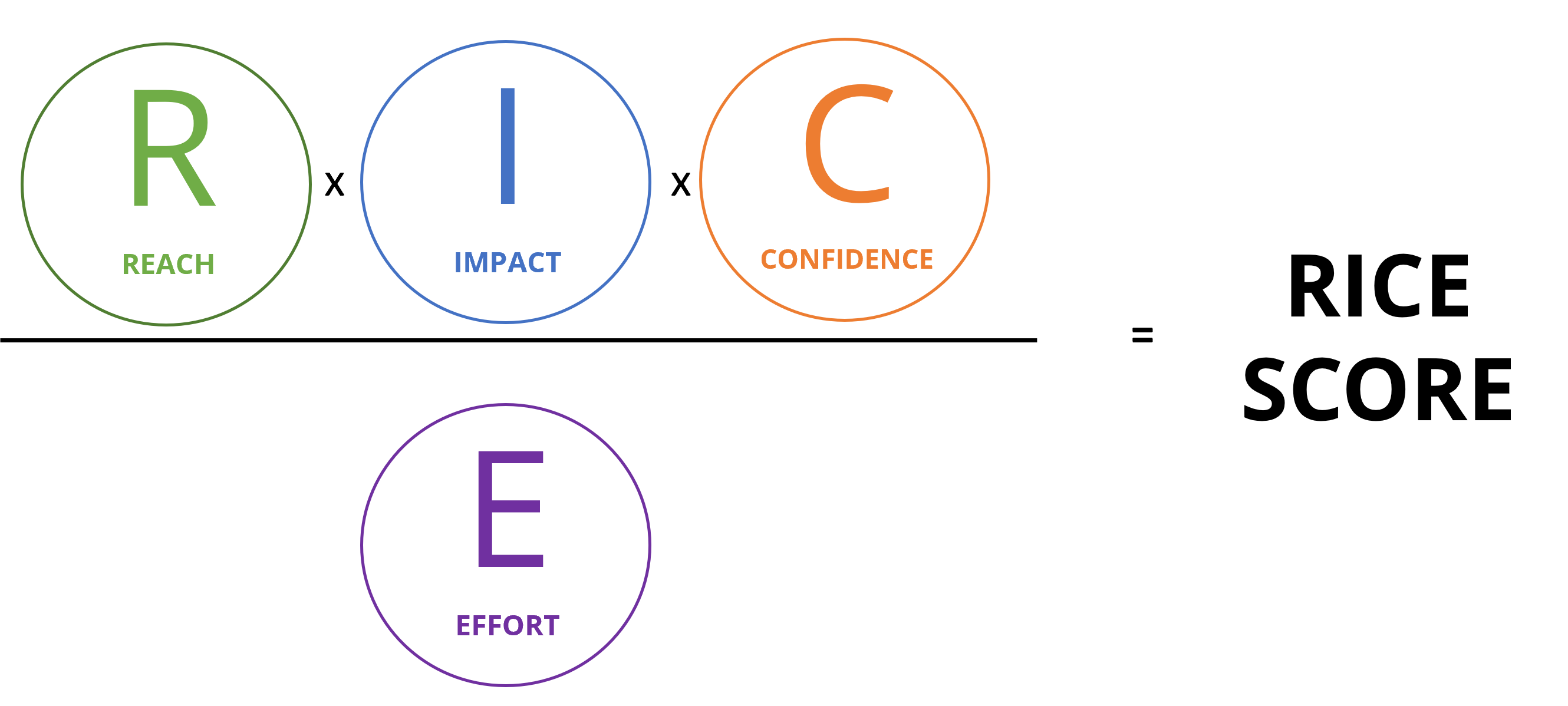 After applying each of these factors to the competing features, the team assigns a score, say from 1-10, based on each factor. The following formula will apply to calculate the overall performance of the features in relation to these factors and assign a rice score: